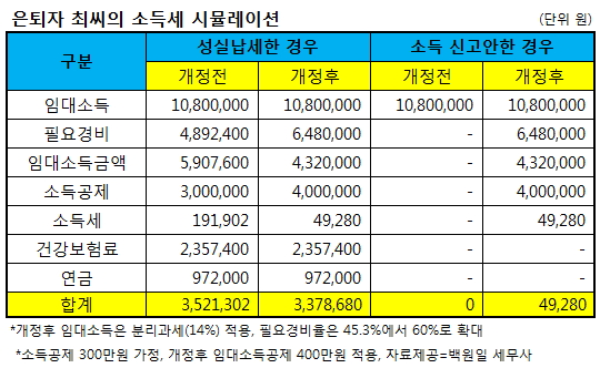 최근 최씨는 연간 임대소득이 2000만원이 안되는 집주인들에게 혜택을 준다는 얘기를 듣고 세금이 얼마나 줄어드는지 궁금해 세무사를 찾았다. 세무사는 변화가 거의 없을 것이란 얘기와 함께 그동안 세금을 내지 않았어야 큰 혜택을 볼 수 있다고 설명했다.