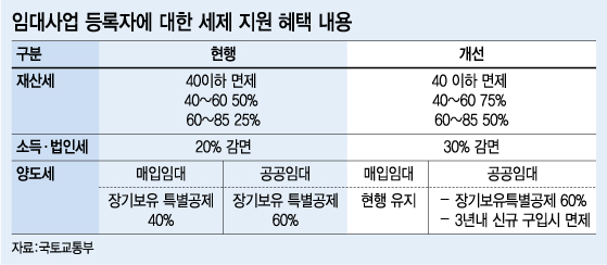 정부는 빠르면 6월 국회에 준공공임대주택에 대한 조세감면을 확대하는 조세특례제한법 개정안을 제출할 예정이다. 재산세 감면율은 전용 40~60㎡는 50%에서 75%로, 전용 60~85㎡는 25%에서 50%로 확대될 예정이다. 소득세·법인세 감면율도 20%에서 30%로 확대된다.
