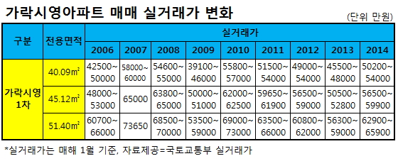 가락시영아파트는 재건축 이슈에 따라 가격이 급격하게 오르내렸다. 국토부 실거래가에 따르면 시영1차 40.09㎡는 2006년 1월 4억2500만~5억원에 거래되다 2007년 1월 5억8000만~6억원까지 1억원 가까이 올랐다. 사업시행계획 논란이 일면서 2009년엔 3억9100만~4억6000만원까지 2년새 2억원 이상 급락했다.