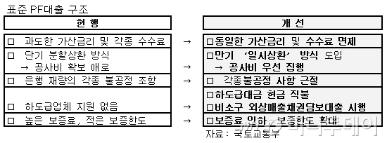 국토부 관계자는 "최근 경기침체로 은행들이 시공사 지급보증을 기피하고 PF 대출을 대폭 축소하는 등 주택건설 시장이 어려움을 겪고 있어 표준 PF대출을 도입하게 됐다"고 설명했다.