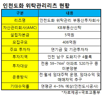 24일 IB(투자은행)업계에 따르면 KB부동산신탁은 인천 남구 도화지구 4블록에 들어서는 중소형 아파트를 매입, 임대주택으로 운용·처분하는 '인천도화 위탁관리리츠' 설립을 추진한다. 인천시가 추진하는 '누구나 집' 프로젝트의 일환이다.
