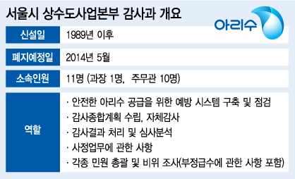 서울시 고위 관계자는 2일 "상수도사업본부 감사과는 제역할을 하지 못하기 때문에 빠르면 이달 중 폐지될 것"이라며 "감사과 일부 인력은 서울시 감사관 소속으로 편입될 것"이라고 설명했다.