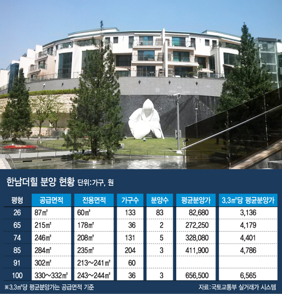 아직 거래가 이뤄지지 않은 302㎡의 분양가를 58억원으로 예상해 계산할 경우 '한남더힐' 분양가 총액은 2조623억원으로 추정된다.