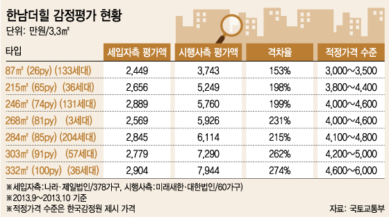 감정원에 따르면 입주자측 의뢰로 제일·나라감정평가법인에서 감정한 '한남더힐' 600가구에 대한 평가총액은 1조1699억원이며 시행사측에서 의뢰한 미래·대한감정평가법인의 평가총액은 2조5512억원이다. 시행사측과 입주자측 평가총액 차액이 1조3813억원이나 났던 셈이다.