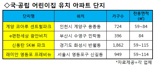지난달 분양한 부산 수영구 민락동 'e편한세상 광안비치'도 단지 내 연면적 430㎡ 규모의 국·공립 어린이집을 유치할 예정이다. 현재 잔여 물량을 분양중인 '신동탄 SK뷰 파크'는 단지 내에 최대 140명 규모의 시립어린이집이 들어선다. 서울 영등포구 신길뉴타운 11구역 '래미안 영등포 프레비뉴'도 단지 안에 구립 어린이집을 신설할 계획이다.