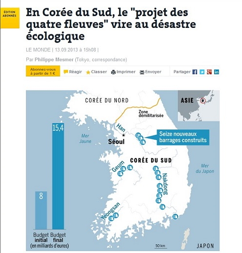 #지난해 9월 프랑스 파리로 출장을 간 건설업체 직원 김모씨(43)는 통역사로부터 놀라운 얘기를 들었다. 프랑스 유력 일간지 '르몽드' 1면에 우리나라 관련기사가 큼지막하게 났다는 것이다. 자랑스러운 마음에 급히 신문을 구해 읽어보니 4대강사업이 담합 등 부정부패 문제로 실패작으로 남을 처지에 놓였다는 내용이었다. 특히 4대강사업 실패가 해외에 진출하는 한국기업들에 큰 타격을 줄 수 있다고 르몽드는 보도했다. 김씨는 "마치 우리 건설업체들이 모두 담합과 비리로 얼룩졌다는 식으로 기사가 나와 무척 속상했다"며 "해외발주처들도 우리 업체에 대한 불신이 상당히 생겼을 것"이라고 회상했다.