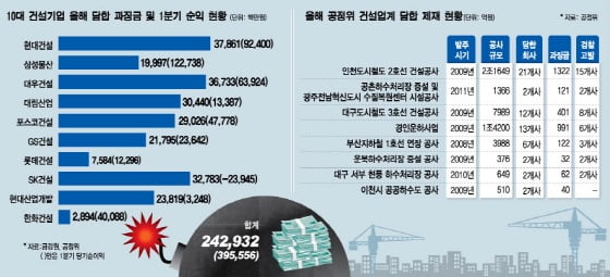 시공능력평가 순위 상위 10개 업체들에 부과된 과징금은 총 2429억원으로 전체의 78%를 차지했다. 이는 올 1분기 이들 업체들이 올린 순이익(3955억원)의 61%가 넘는 금액이다.