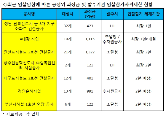 공정위는 이미 올 들어서만 7개 프로젝트, 30개 건설기업의 담합을 조사해 검찰 고발과 함께 총 3000억원 넘는 과징금을 부과했다. 하지만 건설업체들에 과징금보다 더 무서운 것은 따로 있다. 바로 '공공공사 입찰제한'이다.