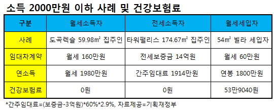 게다가 임대소득이 2000만원 기준을 두고도 논란이다. 연 임대소득이 2000만원 이하면 건강보험료가 0원이고 2100만원이면 연 289만원을 건강보험료가 내야하기 때문이다.