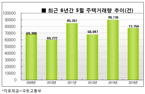 국토부에 따르면 최근 5년간 5월 주택거래량은 △2009년 6만9308건 △2010년 6만272건 △2011년 8만5261건 △2012년 6만8047건 △2013년 9만136건 등으로 평균 7만4604건을 기록했다. 5월 평균으로 따져도 올해가 4.2% 증가한 수치다. 집값이 급등했던 2009년과 비교해도 12.2% 높다.