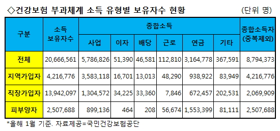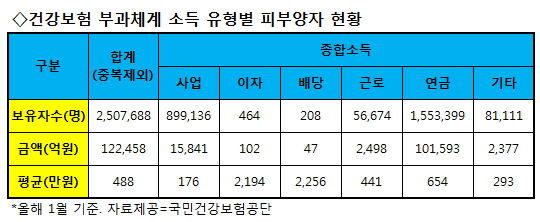 건보료를 내지 않는 '피부양자'(250만7688명·중복제외) 중 △사업소득 89만9136명 △이자소득 464명 △배당소득 208명 △근로소득 5만6674명 △연금소득 155만3399명 △기타소득 8만1111명 등이 다른 소득 보유자인 것으로 나타났다. 건보료를 내지 않는 소득이 12조2457억5100만원에 달한다.