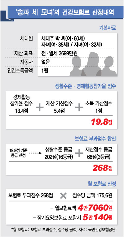 24일 국민건강보험공단에 따르면 '송파 세 모녀'는 지역가입자로 연간 종합소득 500만원 이하에 해당돼 성·연령 등에 따른 평가소득으로 보험료가 부과됐다. 구체적으로 성·연령으로만 계산한 경제활동 참가율점수가 어머니 3점, 두 자매 각 5.2점으로 총 13.4점으로 계산돼 2만6370원의 보험료가 부과된다.