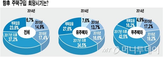 다만 구입희망 시기는 매우 유보적이었다. '연내 구입하겠다'고 답한 응답자는 전체 6.7%에 그쳤다. 이어 △2015년 14.9% △2016년 17.4% △2017년 이후 37.2% 등이었다. 주목할 것은 '구입 계획없다'는 응답도 23.8%에 달했다. 즉 10명 중 6명 이상은 3년내(2014~2016년) 주택구입 계획이 없는 셈이다.