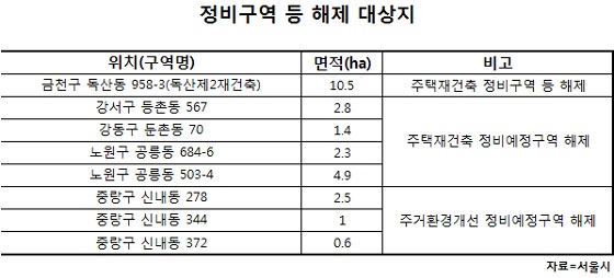 노원구 공릉동 684-6번지 일대와 공릉동 503-4번지 일대는 각각 정비계획 수립 요건을 충족하지 못해 해제 결정됐다. 신내동 278·344·372번지 일대는 각각 지구단위계획 결정과 택지개발사업 등 다른 사업이 시행중인 주거환경개선정비예정구역 지역이어서 해제됐다고 시는 설명했다.