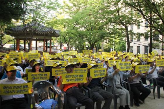 한국기술사회는 지난 16일 서울 역삼동 역삼공원 과학기술회관 앞에서 '국민안전 위협하는 건설기술진흥법 규탄 및 기술사법 선진화 촉구 2차 궐기대회'를 개최하고 거리행진을 펼쳤다. 앞서 지난 5일엔 국회 앞에서 500여명이 모여 1차 집회를 가졌다.