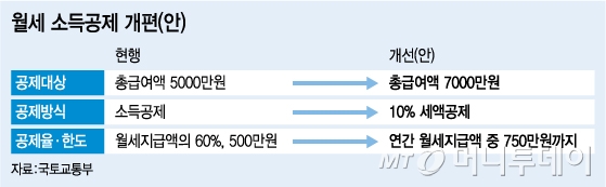 지난 '2·26 주택임대차선진화방안'에서 내놓은 월세 소득공제를 세액공제로 전환·지원하는 방안도 마련됐다. 세액공제율은 연간 월세지급액(최대 750만원)의 10%로 정하고 최대 75만원까지 공제받을 수 있다. 대상도 연봉 5000만원 이하에서 7000만원 이하로 확대했다. 이달 임시국회에 '조특법' 개정안을 제출해 내년 1월부터 시행할 방침이다.
