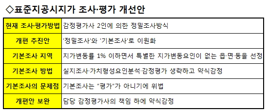이에 대해 감정평가업계는 국토부가 '예산 절감'을 내세워 감정원을 밀어주기 위한 일종의 편법을 동원하고 있다고 꼬집었다. 감정평가협회 관계자는 "명분도 없는 제도개선을 내세우면서 감정원을 살리기 위해 국가 토지정책의 근간을 흔들고 있다"며 "기본조사제도를 철회할 때까지 표준지공시지가 조사·평가 일정에 일체 참여하지 않기로 결의했다"고 말했다.