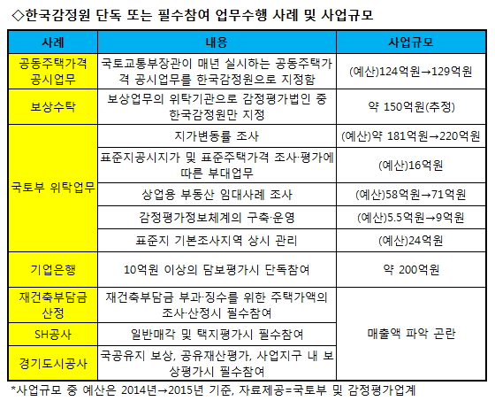 지가변동률 조사나 표준지공시지가·표준주택가격 조사·평가에 따른 부대업무 등 국토부 위탁업무도 사실상 민간 감정평가업체들이 수행하던 업무였다. 실제로 감정원이 현재 관련법이나 공공기관 내규에 따라 단독으로 참여하는 사업은 △공동주택가격 공시업무 △보상수탁업무 △국토부 위탁업무 △기업은행 10억원 이상의 담보평가 등으로, 이를 통한 매출만 약 800억원에 이른다.
