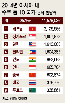 동남아 최대 건설시장인 베트남에서 28억4300만달러를 수주했다. 싱가포르와 말레이시아, 필리핀에서도 각각 16억달러 이상 수주하면서 효자시장으로 자리매김했다. 필리핀의 경우 지난해 전체 수주액(4억8000만달러)의 3배 이상 성과를 거뒀다. 미얀마에서는 1억6000만달러를 수주, 처음으로 1억달러를 달성한 국가명단에 올랐다.