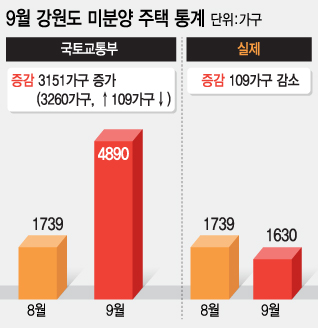 강원도청 관계자는 "9월에 입주자공고를 낸 사업장을 미분양주택에 포함했다"며 "건설업체들이 분양 리스트를 주지 않아 통계 작성이 어려운 상황에서 국토부 보고 날짜까지 맞춰야 해 단지 전체를 미분양으로 처리했다"고 말했다.