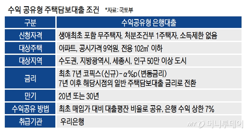 국토부는 대주보의 정관 변경과 보증한도 등이 결정되면 예정대로 우리은행을 통해 최초 7년간 1%대 초저금리로 주택구입 자금을 빌려주는 수익 공유형 주택담보대출을 3000가구 내에서 시범 출시할 방침이다. 대출금리는 대출시점의 코픽스에서 일정 금리를 차감해 결정된다.