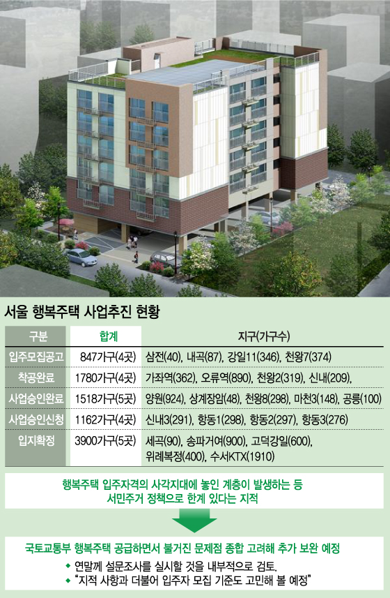 다만 입주자격의 사각지대에 놓인 계층이 발생하는 등 행복주택이 서민주거정책으론 한계가 있다는 지적이 계속되고 있다. 따라서 국토부는 공급 과정에서 제기됐던 문제점들을 종합적으로 고려해 추가 제도 보완에 나설 계획이다.