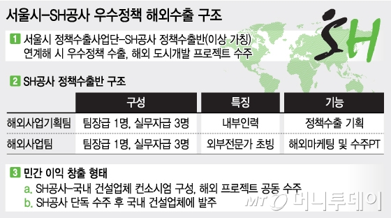 SH공사 관계자는 “신설조직은 서울시 정책수출사업단(이하 정책수출단)과 연계해 도시교통, 상수도 등 도시개발 관련 우수정책을 해외에 이전하고 동시에 관련 개발프로젝트를 수주하는 역할을 한다”고 설명했다.