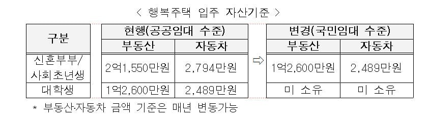 대신 자산기준은 더 엄격해진다. 국토교통부는 발표 당시 시기를 구체화하지 않았지만 자산 기준이 공공임대에서 국민임대 수준으로 강화돼 신혼부부와·사회초년생은 내년 2월까지는 부동산 2억1550만원, 자동차 2794만원까지 허용된다.