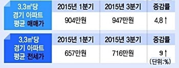 인구유입이 늘면서 경기도내 아파트값은 상승하고 있다. 경기 아파트의 3.3㎡당 평균 매매가격은 올 1분기 904만원에서 3분기 947만원으로, 같은 기간 전셋값은 657만원에서 716만원으로 각각 올랐다.