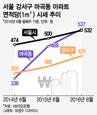 마곡동 아파트 시세는 2년 전만 해도 서울 전체 평균은 물론 강서구 평균에도 미치지 못했지만 이달 면적당(1㎡) 시세는 537만원으로 서울 평균(532만원)보다 높다. 강서구 평균 아파트(429만원)보다는 19.4% 높다.