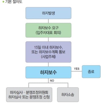 하자가 발견되거나 입주자가 하자보수를 청구하면 사업주체는 공동주택관리법에 따라 15일 이내에 보수해야 한다. 만약 기한 내에 보수하기 어려울 경우에는 하자보수계획에 '하자부위, 보수방법, 보수기한, 담당자 및 연락처'를 기재해 통보하고 계획에 따라 보수해야 한다.