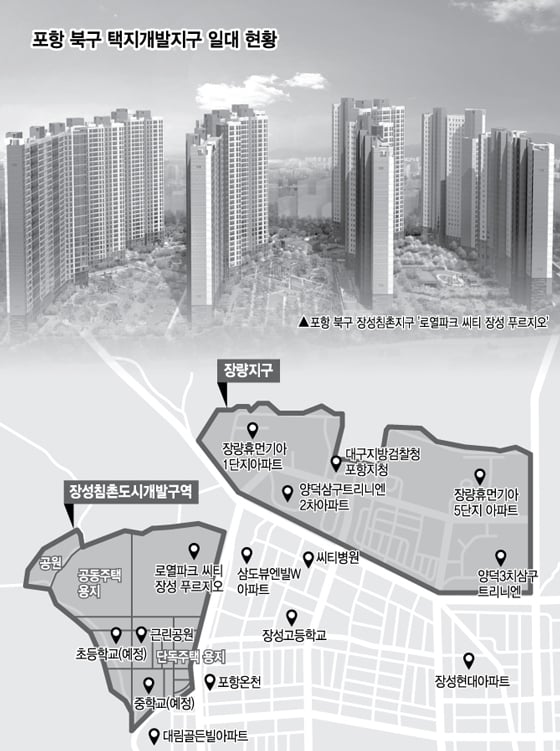 침촌지구는 민간도시개발사업지로 아파트를 비롯해 단독주택, 초등학교, 중학교, 공원, 주차장 등 주거·공공시설이 들어서는 포항 북부 대표 주거단지로 조성된다. 생활인프라가 잘 갖춰진 장성동과 양덕동의 기존 도심과도 가까워 새 아파트를 원하는 수요자의 유입이 기대된다.