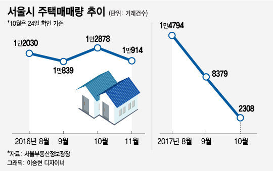 실제로 8.2대책의 정조준 대상지인 서울의 이달 아파트 매매량(서울부동산정보광장 24일 기준)은 2308건으로 지난해 10월(1만2878건)과 비교하면 약 6% 수준으로 1만건 이상이 줄었다. 긴 추선 연휴가 있었던 점을 감안해도 급감했다는 평가가 나온다. 가을 이사철 성수기에는 보통 매달 1만건 이상이 거래되지만 지난달에도 총 8379건으로 전년의 77% 수준에 그쳤다.