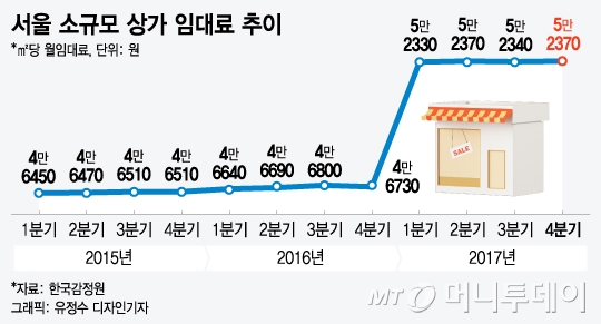 한국감정원에 따르면, 서울 시내 소규모 상가(2층 이하, 연면적 330㎡) 임대료는 지난해 1분기 5만2330원/㎡로 전 분기 대비 12% 급등했다. 건물주 변경과 거래가격 상승이 임대료 인상으로 이어진 것으로 풀이된다.