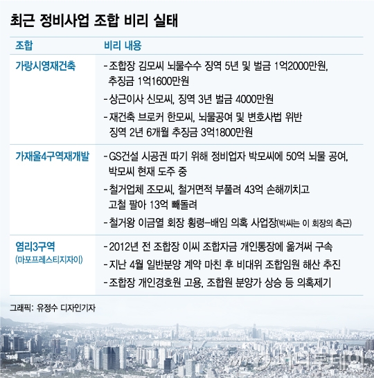 아현3구역 조합원들이 유씨를 끌어내리기까지 5년여간의 스토리는 뉴타운 재개발 역사에서도 손꼽힌다. 10여 년 전 얘기지만 여전히 '진행형'이다. 9500여가구를 신축하는 국내 재건축 최대어 가락시영(헬리오시티)조합장 김모씨는 2016년 뇌물수수로 징역 5년과 벌금 1억2000만원, 추징금 1억1600만원이 확정됐다.