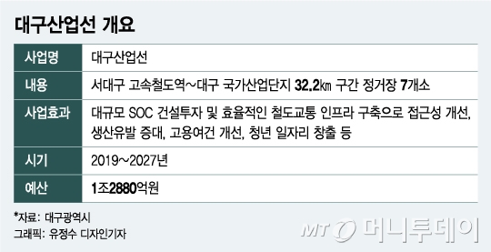 ◇대구산업선, 지역경제 발전 기대=대구산업선은 서대구 고속철도역에서 대구 국가산업단지를 잇는 일반철도다. 총 34.2㎞ 구간으로 공사비 1조2880억원이 전액 국비 지원되며 2027년 완공 목표다. 대구광역시는 서남부 지역에 국가산업단지 등 산업단지 85% 이상이 밀집됐으나 교통상황이 열악해 산단 입주 기업들이 근로자 채용 및 물류비용에서 애로가 많았다는 점에서 지역경제 발전에 크게 기여할 것으로 보고 있다.