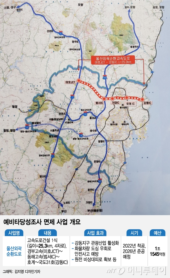 정부가 지난달 29일 예비타당성(예타) 조사 면제 사업으로 확정한 '울산 외곽순환도로'는 경부고속도로 미호JCT에서 국도31호 강동IC까지 총 25.3km를 연결하는 것이다.