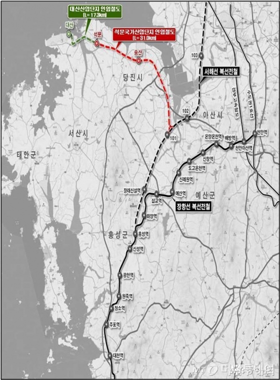 석문산단 인입철도는 충남 당진 합덕(서해선 101 정거장)~석문국가산단을 연결하는 단선 전철로 길이 31㎞다. 사업비는 9380억원으로 전액 국비로 진행된다.