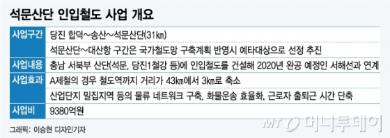 충청남도는 석문산단 인입철도 건설에 따른 생산유발 효과를 3조5000억원, 부가가치 창출효과는 1조2000억원으로 보고 있다. 고용창출 효과도 2만8000명에 달할 것이란 전망이다.