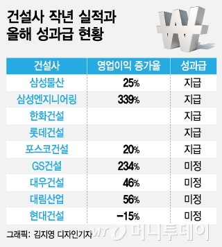 수년간 성과급이 없다 올해 받게 된 건설사들도 있다. 한화건설은 지난달 말 직원들에게 연봉의 평균 15% 정도를 성과급으로 지급했다. 해외부실 사업 정리, 주택사업 호조 등이 실적 개선에 영향을 미친 데 따른 것이다. 삼성엔지니어링 직원들도 지난달 6년 만에 성과급을 받았다.