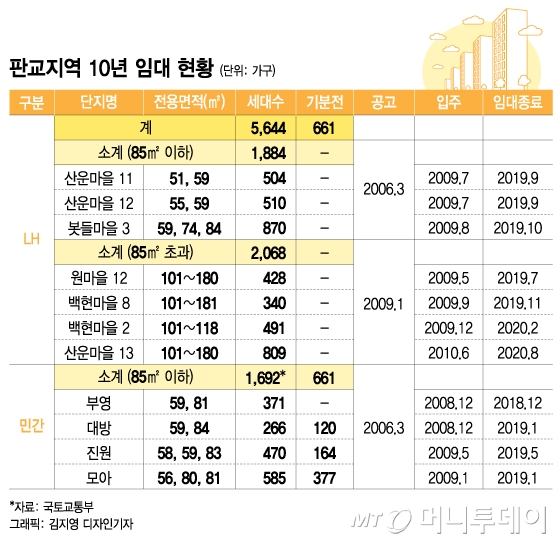 한편 부동산114에 따르면 10년 공공임대 입주자들이 판교에 처음 입주한 2009년 판교 분양아파트의 평균 분양가는 3.3㎡당 1601만원이었다. 최근 시세는 3308만원으로 2배 이상이 됐다. 10년 공공임대 분양전환가격은 감정평가금액을 초과하지 못하도록 해 통상 주변시세의 85~90%에 책정된다.