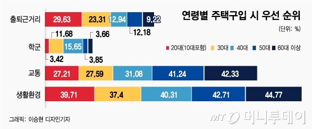 ‘교통’(33.61%) ‘출퇴근 거리’(16.29%)가 뒤를 이었다. ‘학군이 가장 중요하다’는 답변 비중은 전체의 9.53%로 4개 항목 중 가장 낮았다. 연령대별로 약간 차이가 있지만 생활환경과 교통 등을 더 따지는 경향은 고르게 나타났다.