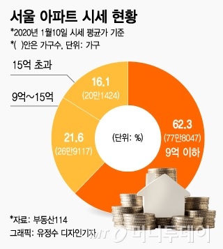 16일 부동산114에 따르면 이달 10일 기준 서울 아파트 124만8588가구 중 37.7%인 47만541가구가 매매가 9억원 이상으로 집계됐다. 3월 시행 예정인 주택구매자의 통장 잔액, 소득, 증여 여부 등을 전수 조사하는 조치의 기준이 9억원 초과 여부다. 사실상 서울 아파트 10채 중 4채는 검증 대상이 된다는 의미다. 특히 강남3구(강남·서초·송파)는 전체 가구의 약 87%가 사정권이다.