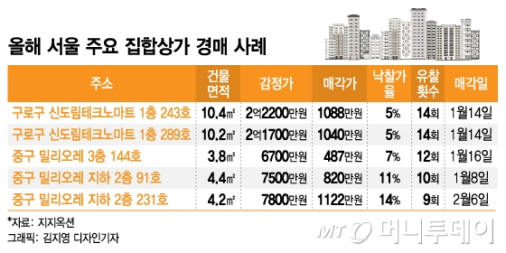 서울 상업시설 경매시장도 전반적으로 움츠러든 분위기다. 지지옥션에 따르면 올해 초부터 지난 10일까지 서울 시내에서 상가, 오피스텔 등 업무상업시설 2200건 경매가 진행됐는데 이 중 26.9%인 576건만 낙찰됐고, 평균 낙찰가율은 51.4%로 집계됐다.