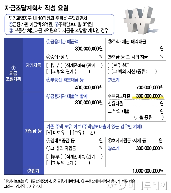 10억원짜리 아파트를 투기과열지구에서 구입했을 때 어떻게 해야 할까. 금융기관 예금액 3억원, 주택담보대출 3억원, 부동산 처분대금 4억원으로 자금을 조달한다면 자기자금 칸에 있는 금융기관 예금액에 3억원, 부동산 처분대금 4억원을 기재해야 한다.