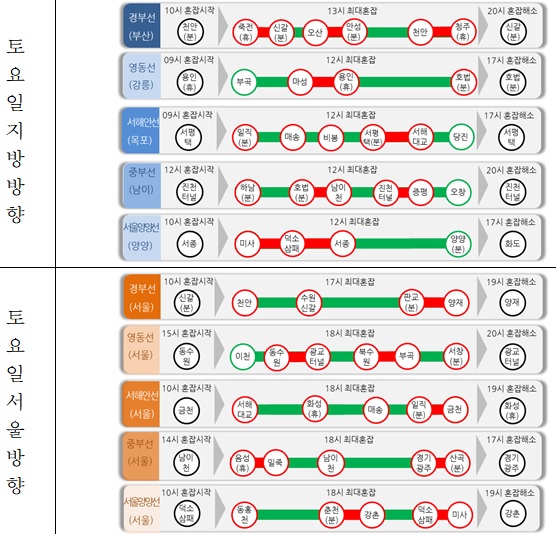 구간별 예상 소요시간은 토요일 서울에서 대전까지 2시간10분, 부산까지 5시간10분, 광주까지 4시간이 걸릴 것으로 예측됐다. 일요일 서울방향으로는 대전에서 2시간10분, 부산에서 5시간10분, 광주에서 3시간50분 등이다.