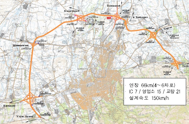 카자흐스탄 알마티 순환도로는 도로공사가 해외도로를 운영·유지관리 하는 첫 사례이며 도로공사는 오는 2030년까지 해외도로 1000km 운영·유지관리 수주를 목표로 하고 있다.