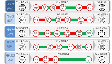 구간별 최대 예상 소요시간은 토요일 서울에서 대전까지 2시간30분, 부산까지 5시간30분, 강릉까지 4시간이 걸릴 것으로 예측됐다. 일요일 서울방향으로는 대전에서 2시간20분, 부산에서 5시간20분, 강릉에서 3시간40분 등이다.