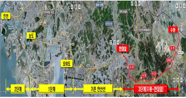 수원~인천 복선전철 건설사업은 앞서 지난 2012년 6월 1단계(오이도~송도) 구간을 개통한데 이어 2016년 2월 2단계(송도~인천) 구간을 개통해 운행 중이다.