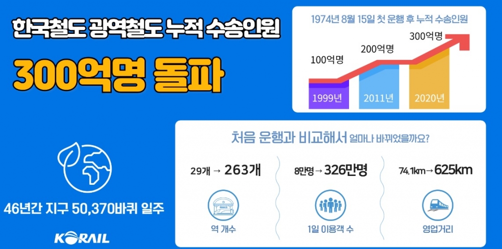 한국철도(코레일)는 광역철도 누적이용객이 300억명을 돌파했다고 10일 밝혔다. 1974년 8월15일 수도권전철 1호선 개통 이후 46년 만이다.